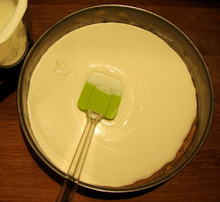 Wkłada tortownicę do lodówki, a w misce ubija kremówkę. W drugiej miesza serek z cukrem, sokiem z cytryny, ekstraktem. Do całości dodaje śmietanę i miesza. Gładką masę wylewa na tortownicę.